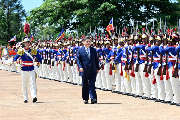 當(dāng)?shù)貢r(shí)間11月20日上午,國(guó)家主席習(xí)近平在巴西利亞總統(tǒng)官邸黎明宮同巴西總統(tǒng)盧拉舉行會(huì)談。會(huì)談前,盧拉總統(tǒng)和夫人羅桑熱拉熱情迎接習(xí)近平,并為習(xí)近平舉行隆重盛大歡迎儀式。新華社記者 翟健嵐 攝
