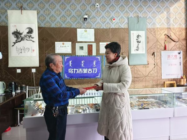 王宏華一行先后走進(jìn)僑眷烏力吉創(chuàng)辦的烏力吉傳統(tǒng)手工藝工作室、歸僑托迪經(jīng)營的特榮民族文化傳媒有限公司、僑眷艾吉瑪?shù)奶柟媚镂幕l(fā)展有限公司,為他們送去慰問金,把黨和政府對歸僑僑眷、海外僑胞的關(guān)心關(guān)愛送到僑界群眾的心坎上。